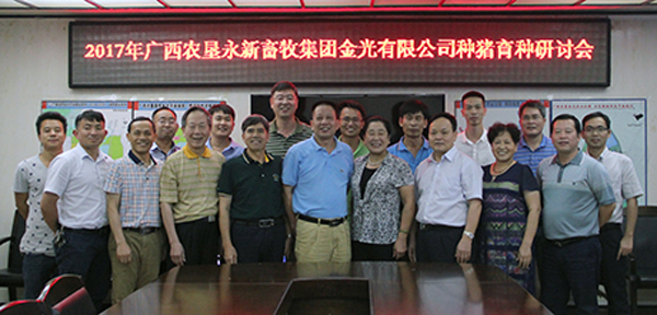2017年5月26日, 广西农垦永新畜牧集团金光有限公司组织召开了种猪育种工作研讨会, 会议邀请了广西水产畜牧兽医局畜牧与饲料处副处长罗军高级畜牧师,广西大学博士生导师、国家生猪产业技术体系广西创新团队首席科学家兰干球教授,广西大学动物科学技术学院郭亚芬教授等专家出席并作讲话。