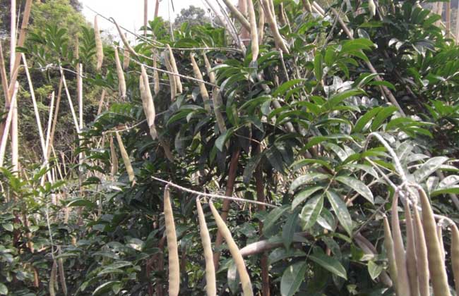 4、修剪整枝:对藤蔓型或小灌木型牛大力品种要通过修剪管理控制植株枝条生长,使地下薯结多、生长快、增产量。对不用于做繁殖种植的植株应疏剪掉强旺枝,抑制藤蔓生长,保持植株高度,越早修剪越好,促其养分供应根部生长。对于留种子用于繁殖的植株,除前期的修剪外,要取宇花灵2号一瓶兑水30公斤作叶面喷施,连喷2~3次后,在3~4月定植的植株可在6~9月进入开花期。