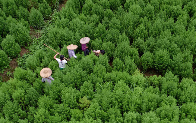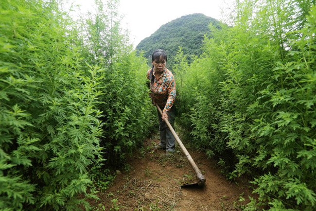 7月19日,广西柳州市融安县泗顶镇吉照村,农民在田间管护青蒿。近日,广西柳州市融安县种植的近万亩青蒿开始进入收获季。广西柳州市融安县是目前国内外较大的青蒿素生产基地,是广西青蒿草种植大县之一,种植青蒿面积近万亩。位于该县的广西仙草堂制药有限责任公司则是国内规模较大的青蒿素提炼加工企业,每年加工生产出青蒿素60余吨,主要出口到印度、越南、巴基斯坦、印度尼西亚等“一带一路”沿线国家和非洲部分国家,用来作为抗击疟疾的基药。融安县采用“公司+基地+科研单位+合作社+农户”的模式,发展青蒿种植,由企业向农户免费提供种子,与农户签订保底价收购合同,每亩纯收入约1400元人民币,成为山区贫困农民脱贫致富的主要产业之一。