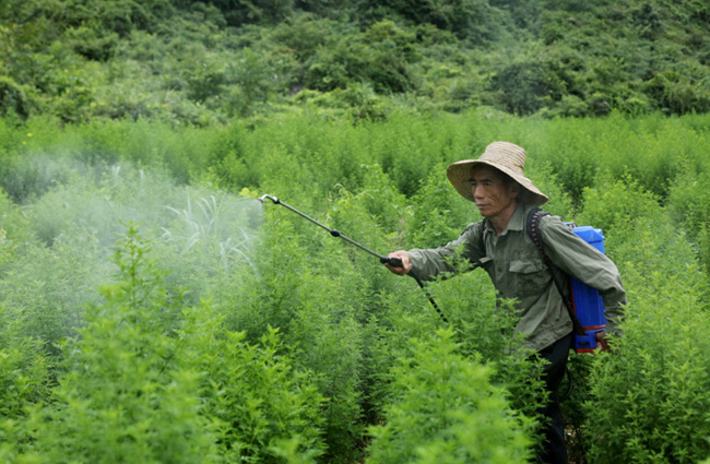广西柳州市融安县泗顶镇吉照村,农民覃义福在青蒿地里打药杀虫