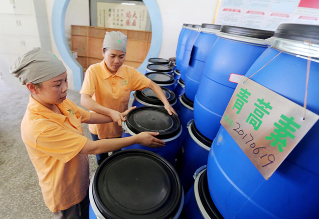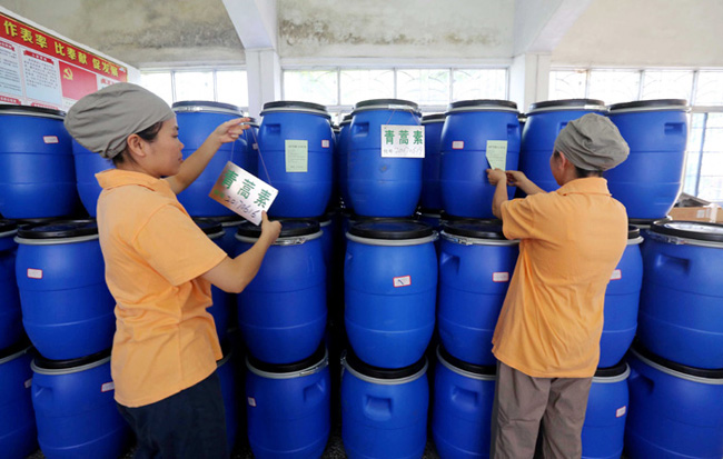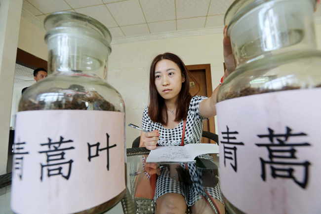 广西仙草堂制药有限公司,一名工作人员在登记青蒿叶样品