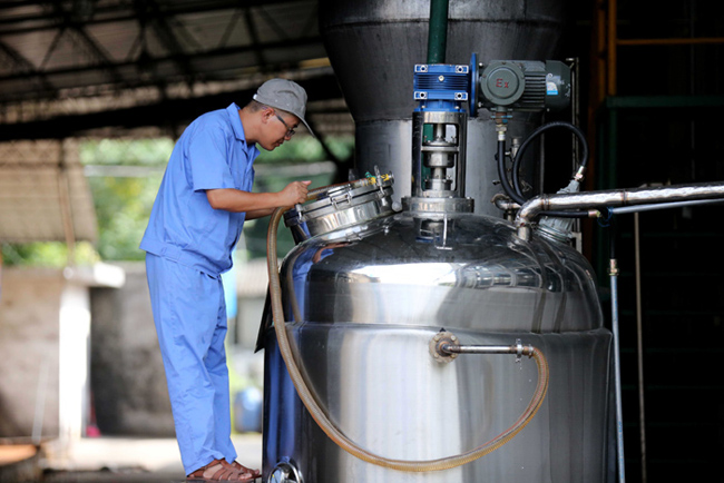 广西仙草堂制药有限公司青蒿素提取车间,一名工人在生产线上作业