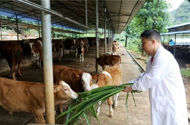 广西柳州市融安县泗顶镇弘康生态养殖场,丁善勇在观察“西门塔尔”牛进食情况。
