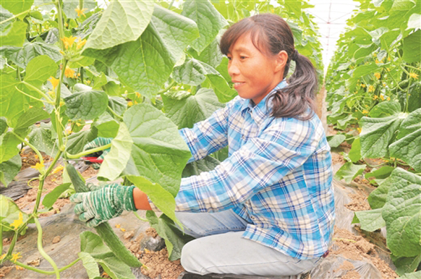 福成镇宁海村民在大棚里高兴地采摘青瓜。
