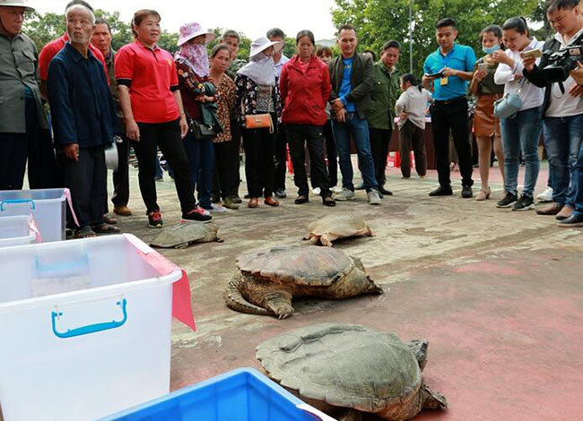 11月6日,在扶绥县中东镇举办的第三届龟鳖争霸赛暨土特产品展示会上,群众在一睹龟王“尊容”。