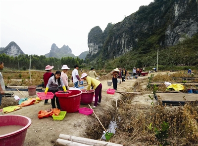 连日来,金城江区侧岭乡拉合村“三红”现代农业示范区核心区百万良种油茶苗圃基地,每天都有数十名贫困劳动力在培育油茶种苗。
