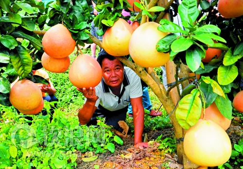 图为近日果农在灵山县三海街道卢三优质三红蜜柚示范园察看满园丰收成熟的柚子。