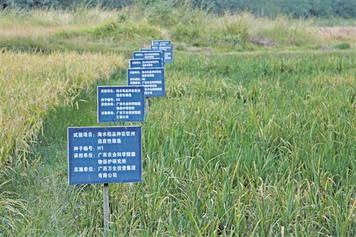 海水稻是一种在靠近海水的滩涂、盐碱地中生长的水稻品种,自古就有,由于产量低而一直默默无闻。近年来,由于受到袁隆平院士的关注,海水稻在网络上“迅速走红”,越来越多的机构对海水稻进行研究和开发。不过,这些研究大多还处于起步阶段,很多人对海水稻并不是很了解。近日,本报记者跟随广西农业科学院和广西大学的专家,走访了位于钦州市的广西第一个海水稻研究基地,接触到这个略带神秘的“网红”。