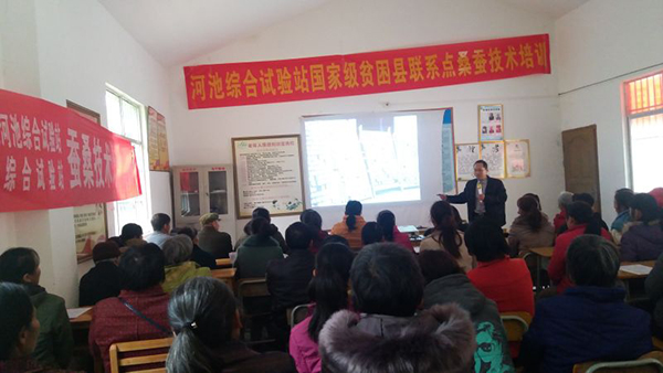 培训课上,国家蚕桑产业技术体系河池综合试验站站长廖先谋详细讲解了脓病、僵病、败血病等常见蚕病的发病症状和防治方法、中毒的识别和防范、蚕在各生长阶段的饲养技术等知识;国家蚕桑产业技术体系河池综合试验站农艺师张寿彬讲授桑园高产栽培及病虫害防治方法、桑叶采摘、蚕室蚕具消毒等知识进行系统培训,向蚕农发放《种桑养蚕技术要点》读本,并对蚕农在种养过程中遇到的问题作详细解答,现场气氛非常热烈。