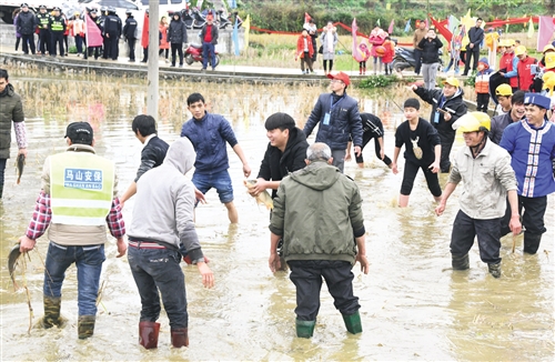 热闹的浑水摸鱼游戏 记者 宋延康 摄