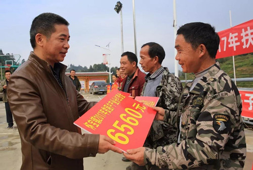 2017年怀宝镇扶贫产业首批分红仪式上,卢兵(左)向贫困户发放黑香猪养殖分红