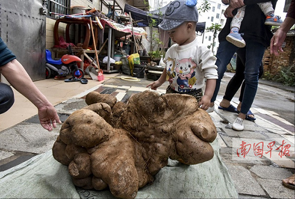 3月20日,南国早报记者在陈先生家中看到,大薯宽约60厘米,高约40厘米,外皮呈浅黄色,整体由多个呈不规则形状的茎块组成,形似一个大核桃仁。“能见到这么大的薯,也算是长见识了!”记者采访的时候,碰到不少居民前来看热闹,看到这么大的薯,他们啧啧称奇。