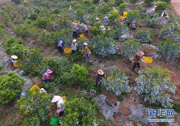 在南宁市良庆区那马镇坛良村坛板坡,当地农民在采收沃柑(无人机拍摄)。