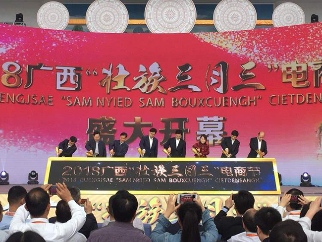 为弘扬广西“壮族三月三”特色民俗文化,深化广西特产线上线下融合销售的新模式,扩大广西特色产品的知名度和销售量,4月12日上午,2018广西“壮族三月三”电商节在桂林国际会展中心盛大开幕。全国政协经济委员会副主任房爱卿、自治区政协副主席刘慕仁,自治区商务厅、自治区两新组织党工委、桂林市人民政府等单位领导,以及京东集团、苏宁易购、慧聪网、猪八戒网等知名电商企业高管出席本次开幕活动。