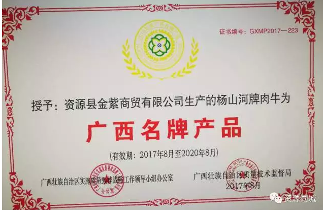 公司先后获得广西壮族自治区肉牛养殖标准化示范场、 桂林市农业产业化重点龙头企业、 广西畜禽现代生态养殖五星级示范场、 广西壮族自治区水产畜牧产业化重点龙头企业、国家级养殖标准化示范场等荣誉称号,2017年获肉牛、肉羊、牛肉、牛骨、牛排、羊肉有机认证,同年公司生产的“杨山河”牌肉牛2017年8月被广西自治区技术监督局评为“广西名牌产品”,并被广西名优农产品企业联合会授予“广西名优农产品重点推荐品牌”。