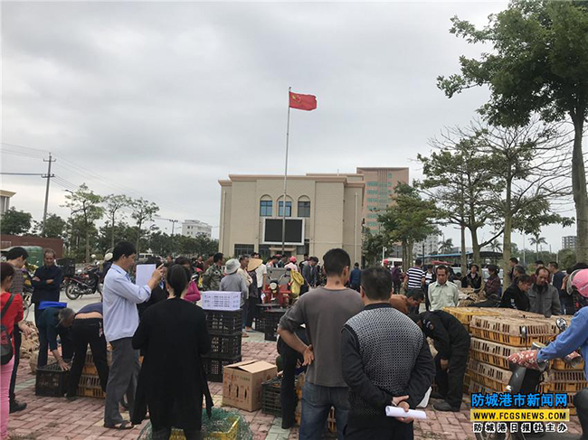 4月27日,港口区企沙镇坳顶、虾箩等6个村的村民等待领取由政府采购、免费发放的光坡鸡鸡苗。这次政府共发放鸡苗5160羽。