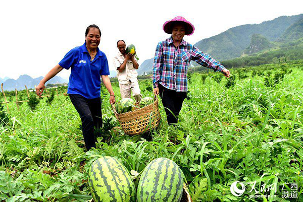 据了解,广西德保县利用坡地发展脐橙种植,脐橙一般3至4年才开始挂果,为充分合理利用土地资源,该县足荣镇念色村敦屯群众进行果园套种西瓜。通过采用果林下套种西瓜模式,种植周期短、效益见得快的西瓜,如今套种的300亩西瓜长势喜人,第一批成熟的西瓜已陆续上市,亩产一般在3000斤以上,通过合理利用土地,有效增加了农民收入。