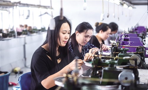 千圣禧服饰的工人在进行毛衫的套口作业,该企业属于濮院镇最早的一批毛衫企业。浙江省桐乡市濮院镇2016年成为首批中国特色小镇,如今也是国家级的“毛衫时尚小镇”。 新华社记者 徐 昱摄