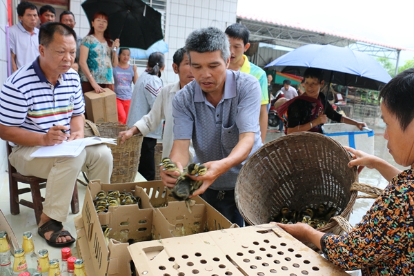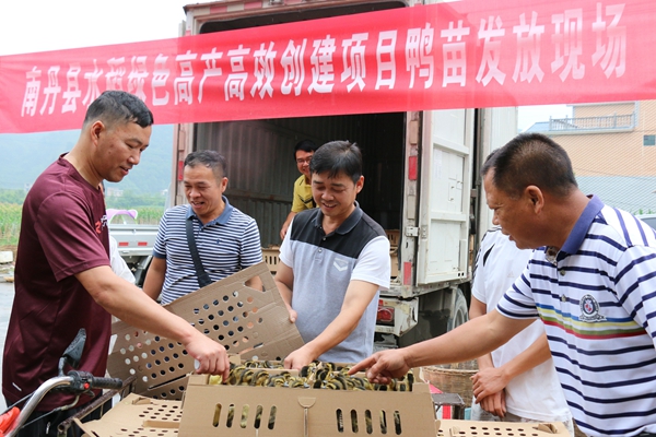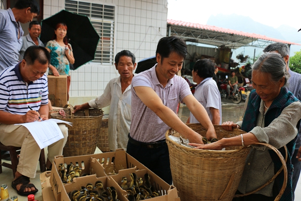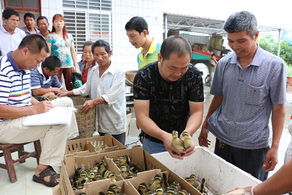 6月11日,南丹县城关镇拉易村、中平村村口人口攒动,该县农业部门正在给当地农民群众发放鸭苗,每个农户可以免费领到16只鸭子回去养。现场还积极向农户推广“稻鸭共育”技术,该技术利用鸭子杂食性特点,在稻田秧行中敏捷穿行除虫除草,鸭的粪便还可以给稻田培肥,从而提高大米和鸭肉的品质,减少农药和化肥使用带来的环境污染,实现生态效益和经济效益双赢目标。
