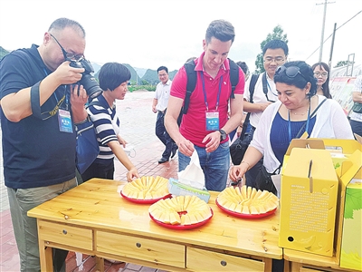 图为采访组的记者在品尝哈密瓜。(本报记者 马婧 摄) “你们的哈密瓜又脆又甜,请问有快递吗?我想买点回去,让家人、同事也尝尝武宣的哈密瓜。”25日,自治区“境外媒体看广西”采访组来到武宣县桐岭镇现代特色农业(核心)示范区,当了解到该示范区的哈密瓜能为贫困户每年增收约18000元时,来自阿尔及利亚的外籍记者法伊萨立即咨询园区工作人员。据了解,由新加坡、越南、阿尔及利亚、西班牙、葡萄牙等国的外籍记者和我国人民网外语频道记者组成的采访组,将在我市开展为期两天的实地采访活动。