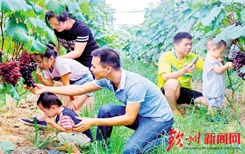 “这里的葡萄真甜,真好吃!”“爸爸,这串葡萄好,我们就剪这串葡萄了。”近日,在灵山县三海街道枚埠村刘灯杰家的葡萄园里,不少游客周末前来这里品尝和采摘饱满紫红的葡萄,开展家庭亲子活动,热闹非凡。“我们枚埠村距离县城只有十几公里,自龙武大道开通后,到县城只需20分钟左右的车程,我的葡萄主要是销售到县城及周边,有时还不够卖。”刘灯杰和村民一样,在三海街道精准扶贫工作指导下,加入了丰美村民合作社,依托自身资源优势和龙武百年荔枝核心示范区的辐射带动作用,因地制宜,因势利导,在家发展葡萄产业,获得了良好的收益。