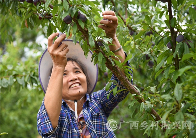 7月25日,在罗城仫佬族自治县兼爱乡甘逢村果场,村民正在采摘珍珠李。兼爱乡地处偏远的罗城西北部,海拔较高气候偏寒,是全县贫困发生率较高的乡镇之一。为了加快群众脱贫步伐,2015年,兼爱乡党委政府认真抓好“三特”水果扶贫产业工作,积极引导罗城迎丰种养农民专业合作社在甘逢村尧河屯海拔700米左右的大贯牛坡区示范种植珍珠李,今年已有500余亩开始成熟挂果,预计产量达7.5万公斤,收入达75多万元,成为兼爱乡又一脱贫产业。