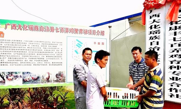 广西大化“七百弄鸡”来自中国长寿养生之乡——大化瑶族自治县,这里生态优良、空气清新、水源无污染,是中国绿色食材基地县。大化县把发展“七百弄鸡”作为扶贫主打产业,在国家精准扶贫政策的感召下,广西大化桂通农林发展有限公司积极投入到精准扶贫的浪潮中,采用“公司+基地+合作社+养殖户”模式开展规模化生态健康养殖,依靠科技促进“七百弄鸡”产业化发展,依托龙头企业带动养殖户特别是贫困户养鸡增收,实现精准扶贫、精准脱贫目标。