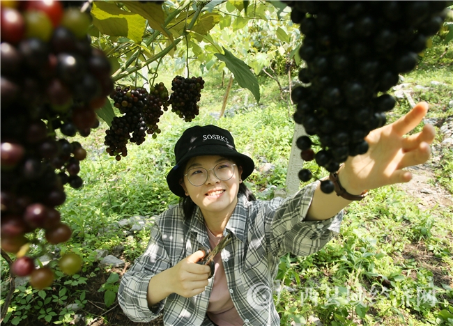 现在正是葡萄成熟的季节,许多来自城里的人,除了品尝葡萄外,更喜欢自己到葡萄园里采摘。来自县城的林颖说:“我听说东起的山野葡萄特别好,今天特地到这里来,体验一下采摘葡萄的乐趣。”