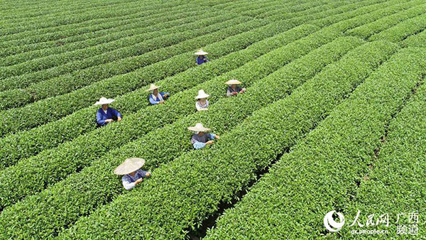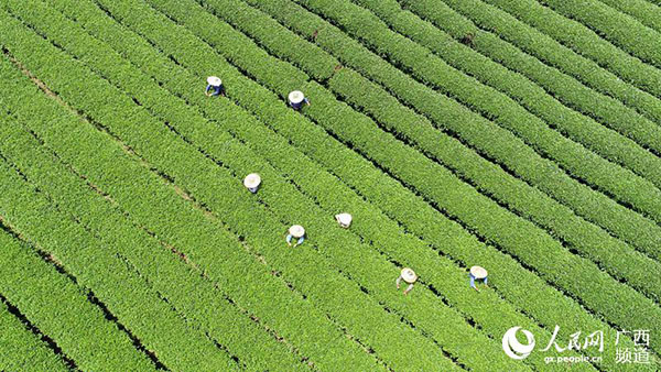 8月22日,茶农在广西三江侗族自治县八江镇八江村茶园内采摘秋茶。处暑将到,中国名茶之乡——广西三江侗族自治县迎来秋茶采摘旺季,茶农们在茶园里的忙碌身影如同点缀在五线谱上的跃动音符,美不胜收。