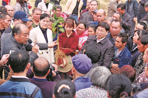自治区农业厅相关负责人向都安瑶族自治县果农推介沃柑良种良苗。 (自治区水果总站供图)