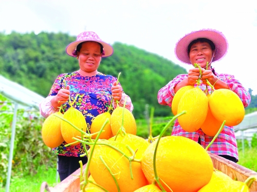 近日,天气晴好,记者来到该村的哈密瓜基地,只见一个个金黄的哈密瓜吊在大棚内长得十分喜人,游客一批接一批地赶来游玩采摘。