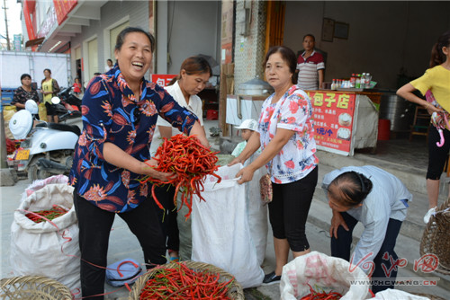 近日,笔者在南丹县六寨镇龙马村的长角辣椒种植地里看到,村民们手挎竹篮采收成熟的辣椒,一片繁忙的景象。而在大街上,长角辣椒更是得到市民的青睐,不一会儿就销售一空(如图)。
