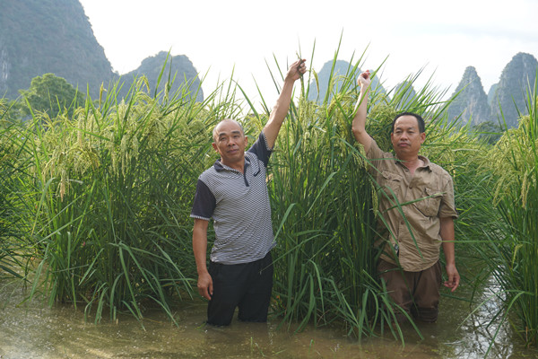 9月6日,贺州市县农业专家亲临巨型稻与特种鱼共生区考察指导工作。