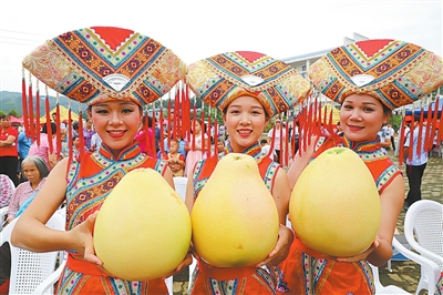 进入9月以来,武宣县东乡镇风沿村红心柚已全部成熟,今年产量预计可达150多万斤。9月8日,该村举行第三届蜜柚节,通过体验采摘、免费品尝、“果王”评比拍卖、展销推介等方式,加大宣传推介力度,扩宽红心柚销售渠道。图为展销人员在向游客展示推介柚子果。(特约摄影记者 陈冬梅 摄影报道)