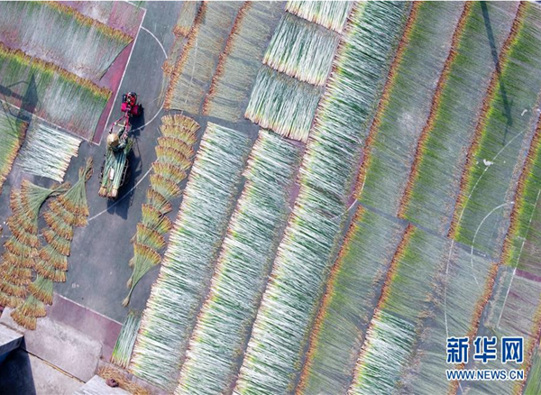 10月7日,六羊屯村民在晾晒蔺草(无人机拍摄)。