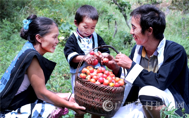 近日,南丹县里湖瑶族乡岜地村7队村民王国江一家3口正在海拔1100多米的高山上采摘成熟的本地西红柿,脸上堆满了幸福的笑容。