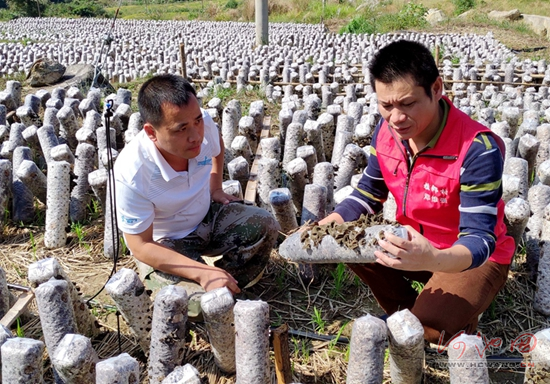 图为驻村第一书记正在查看黑木耳长势。