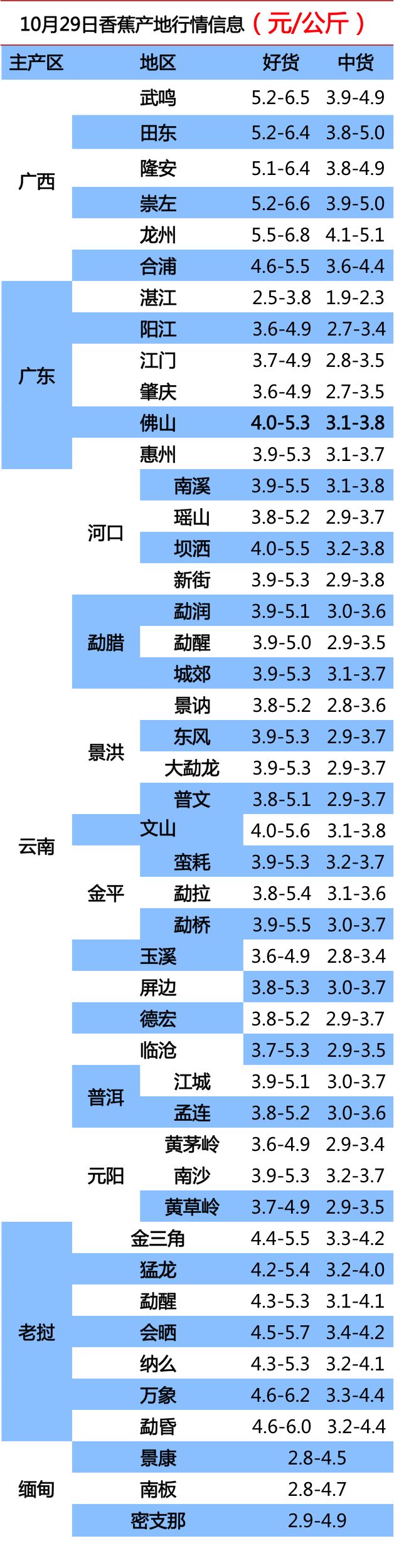 广西产区今日整体变化不大,部分保持微涨,6元蕉价较为普遍,目前崇左、田东等产地部分基地开始陆续收尾,南宁逐渐成为出货主力区,11初或将成为广西货源最为紧张的阶段。