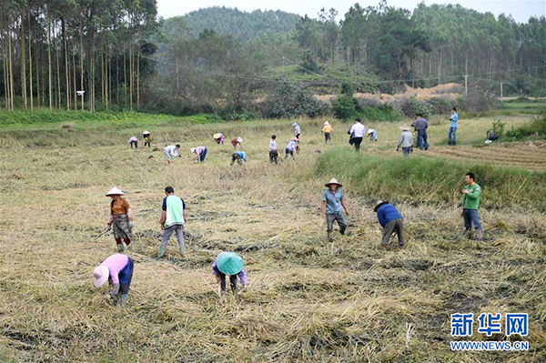 钦州市那丽镇充包村农民在抢收海红米(11月20日摄)。
