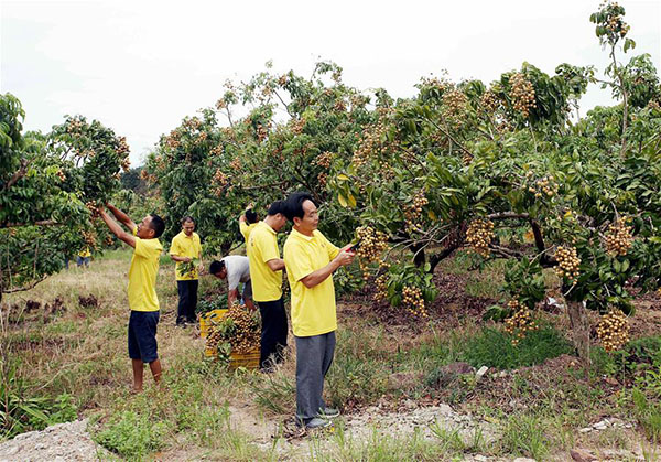 广西平南县安怀镇新益种植合作社的果农在采摘龙眼(8月11日摄)。