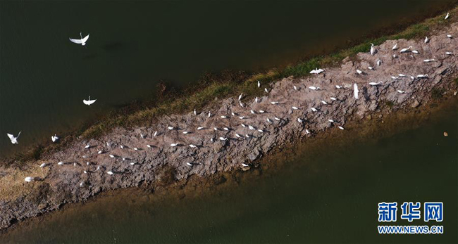 一群白鹭在钦州市康熙岭镇的一处虾塘边休憩(11月26日无人机拍摄)。