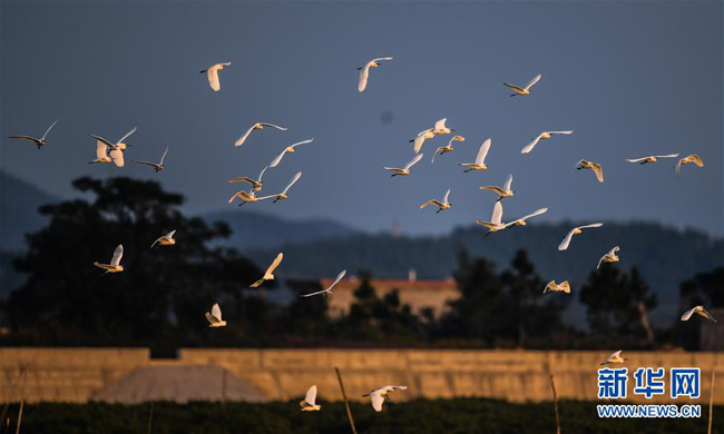 这是落霞余晖下归巢的鹭群(12月5日摄)。