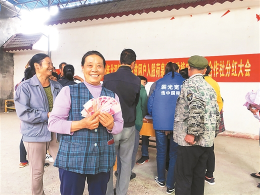 近日,合山市北泗镇瀑泉村60户贫困户领到入股荷泉莲藕种植农民专业合作社的年度分红,此次合作社发放分红近7万元。凌榕佩/摄