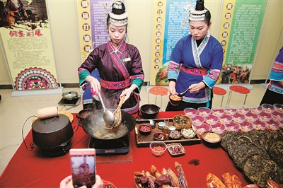 23日,在柳州市群众艺术馆一楼,春节特别活动“柳州非遗学堂”——非遗年货市集展示售卖了9项非遗美食,包括侗族打油茶、柳州螺蛳粉、三江年糕糍粑、柳城牛腊巴、锦桂楼桂饼、寨沙头菜等,让市民感受传统年俗文化,也让年味更加浓郁。
