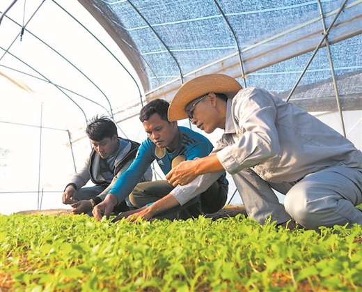 2月14日上午,中国(广西)-柬埔寨农作物优良品种试验站副站长桂刚(图中戴帽者)指导当地村民应用栽培管理技术。(图片由广西福沃得公司提供)