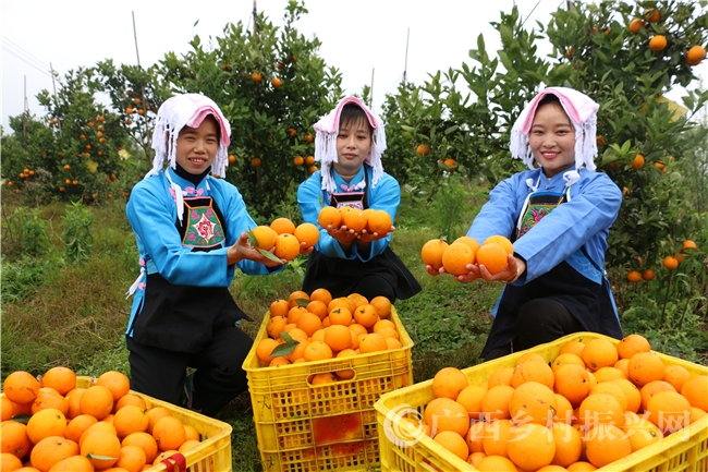 近日,南丹县罗富镇塘丁村金贝篼百果产业示范区的200多亩沃柑成熟了,一进到果园,一颗颗沃柑树挂满黄灿灿的沃柑,个大、新鲜、糖分十足。随处可见身着蓝衣壮服饰的当地群众在果园内采摘、分拣、搬运的忙碌景象。