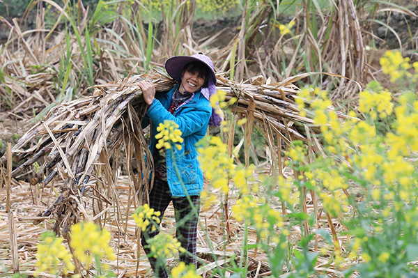 2019年3月4日,在广西柳州市融安县大良镇石门村,一名农民在田间扛运蔗种,准备新种甘蔗。