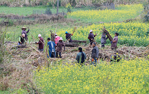 2019年3月4日,在广西柳州市融安县东起乡良村村英村屯,农民在田间砍收甘蔗。阳春三月,正值春耕农忙时节,融安县蔗农抢抓农时,抢收甘蔗,抓紧时间做好春耕备播,广袤的桂北大地处处都是各族群众忙碌的身影。