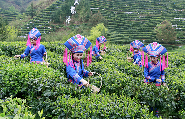 又是一年春茶开采季,连日来,在南丹县六龙茶园中,沐浴过春雨的层层茶树正吐嫩绿,茶农忙着采摘春茶,游客们穿上精致的民族服饰演绎六龙茶女,穿梭于茶园之中体验采茶的乐趣。