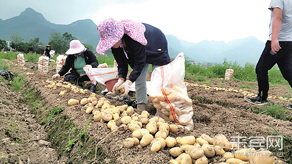 村民将马铃薯装袋。